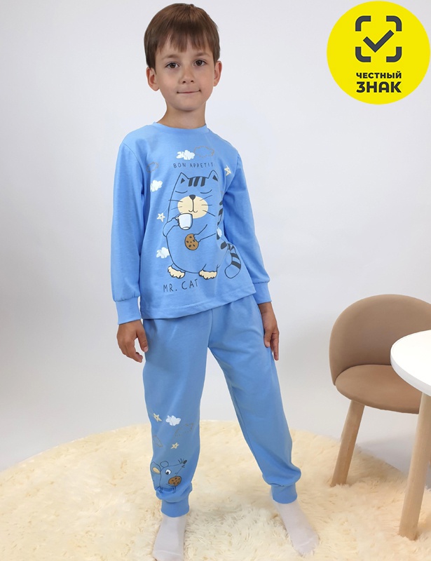 Пижама для мальчика (фуфайка и брюки). Фуфайка прямого силуэта, рукав втачной, длинный на манжете из ластика, спереди печать, горловина обработана ластиком. Брюки-длинные прямые, верхний срез подшит резинкой. Печать на правой стороне внизу.