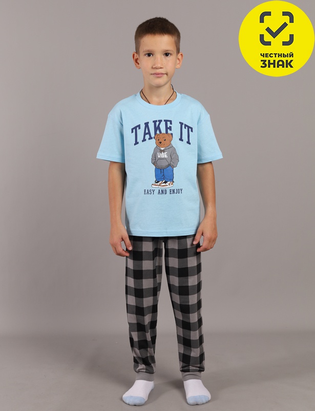 Пижама для мальчика: футболка и брюки из мягкого трикотажа. Футболка с коротким рукавом, горловина круглая из рибаны. На полочке выполнена шелкография . Брюки с поясом на резинке и манжетами по низу из рибаны.