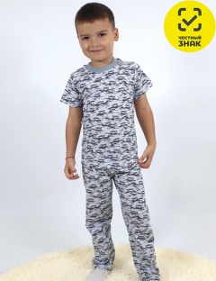 Пижама для мальчика (фуфайка и брюки). Фуфайка - прямая, рукав втачной, короткий. Горловина обработана ластиком. Печать на переде. Брюки - длинные, прямые. Верхний срез подшит с резинкой.
