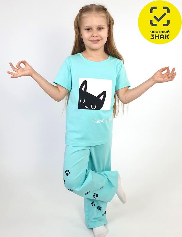 Пижама для девочки (футболка и брюки). Футболка - прямая, рукав втачной, короткий. Горловина обработана планкой. Печать на переде. Брюки(пижамные)-длинные прямые, верхний срез подшит с резинкой. Печать на передних половинках.