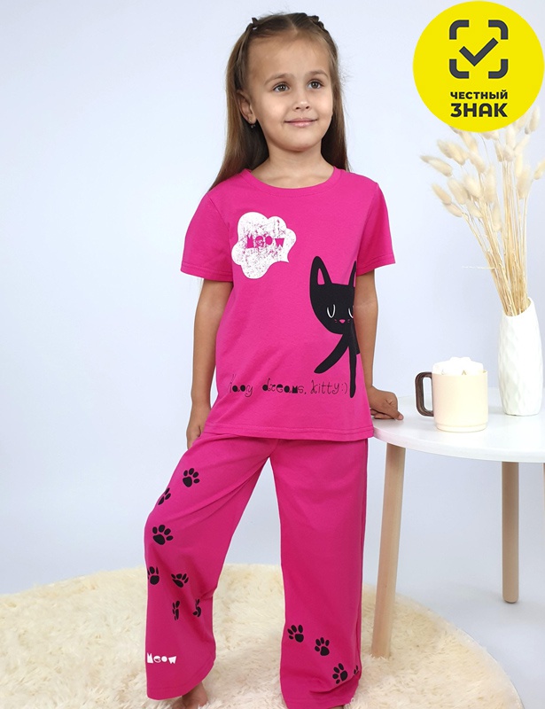 Пижама для девочки (футболка и брюки). Футболка - прямая, рукав втачной, короткий. Горловина обработана планкой. Печать на переде. Брюки (пижамные) - длинные прямые, верхний срез подшит с резинкой. Печать на передних половинках.