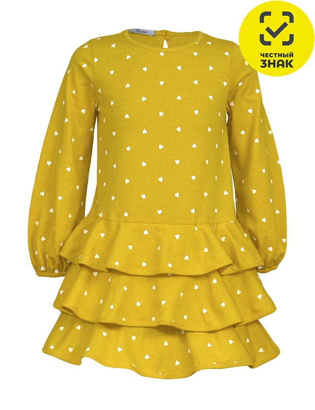 Платье полуприлегающего силуэта, рукав длинный, внизу на резинке. Занижена талия, отрезная юбка с тремя окантованными воланами. Горловина окантована, застежка по спинке на пуговицу.