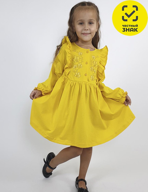 Платье полуприлегающего силуэта, длинный рукав с резинкой «венгерка» внизу. Отрезная юбка со сборкой, рельефы с рюшей. Вышивка на переде. Горловина окантована, застежка центральная на пуговицы.