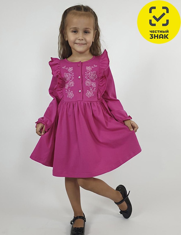 Платье полуприлегающего силуэта, длинный рукав с резинкой «венгерка» внизу. Отрезная юбка со сборкой, рельефы с рюшей. Вышивка на переде. Горловина окантована, застежка центральная на пуговицы.