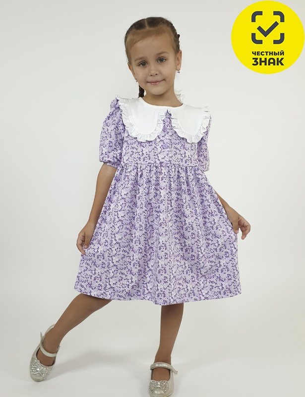 Платье для девочки. У него отрезная юбка в сборку, короткий рукав с резинкой внизу и сборкой по окату. Горловина окантована и подшита, а застёжка центральная на пуговицы. Есть отделочный съёмный воротник с рюшами, который завязывается на бант.