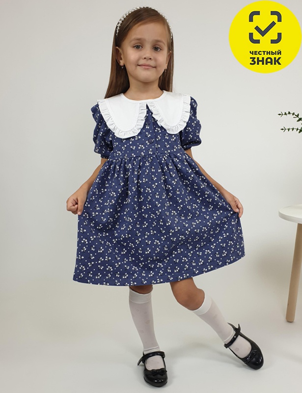 Платье для девочки. У него отрезная юбка в сборку, короткий рукав с резинкой внизу и сборкой по окату. Горловина окантована и подшита, а застёжка центральная на пуговицы. Есть отделочный съёмный воротник с рюшами, который завязывается на бант.