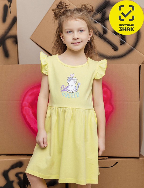 Платье для девочки с отрезной талией и юбкой со сборками. Модель с коротким рукавом-крылышком и округлым вырезом украшена принтом на полочке.