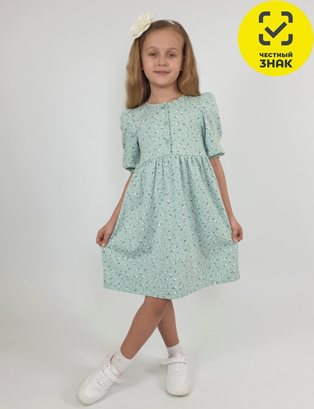 Платье с отрезной юбкой в сборку. Короткий рукав с резинкой внизу, сборка по окату. Горловина окантована и подшита, застежка центральная на пуговицы.