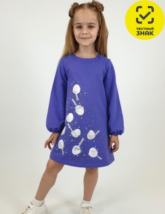 Платье для девочки, силуэт трапеция ,рукав втачной длинный, по низу на резинке. Печать и вышивка пайетки на полочке, горловина обработана обтачкой. Застежка по спинке на пуговицу.