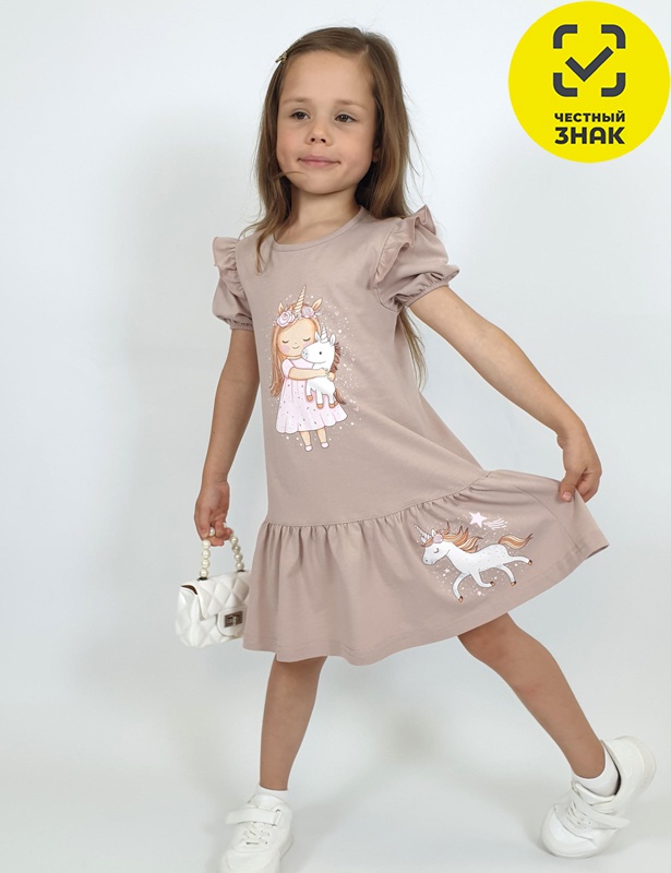 Платье для девочки, силуэт трапеция, короткий рукав "фонарик" на резинке, в пройму вставлена рюша. Юбка отрезная со сборкой. Горловина окантована, застежка по спинке на пуговицу. Спереди печать.