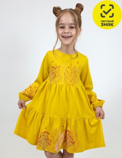 Платье - силуэт трапеция, длинный втачной рукав, внизу собран на резинку. Юбка переда и спинки из двух воланов. Горловина окантована, застежка на пуговицы по спинке. Печать на кокетке, на нижнем волане и на рукавах.