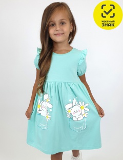 Платье для девочки, перед и спинка с кокеткой, сборка по верху юбки. Рукав короткий, внизу собран на резинку, в пройме рюша. Горловина обработана ластиком. Печать на переднем полотнище юбки.