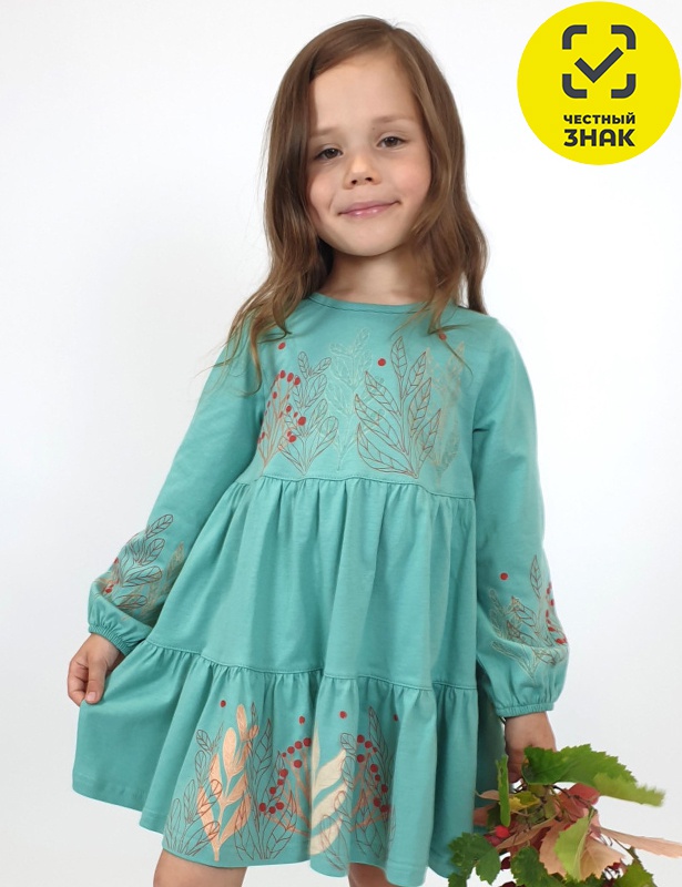 Платье для девочки, приталенный силуэт, длинные рукава - сборка по окату, по низу на резинке. Горловина окантована и подшита, по спинке разрез-застежка на пуговицу. Печать на полочке, юбке переда, рукавах. Отрезная юбка со сборкой.