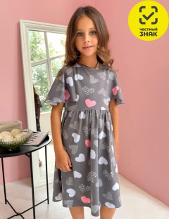 Платье для девочки: из мягкого гладкрашеного трикотажа в набивку сердца. Линия талии немного завышена, по спинке застежка на пуговицы, горловина круглая. Рукава короткие в форме крылышек.