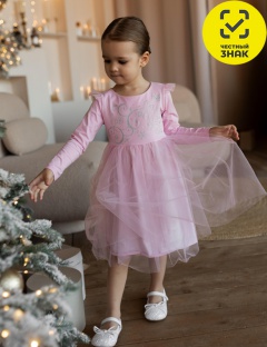 Платье силуэта трапеция, втачной длинный рукав с отделочным элементом из сетки. Отрезная юбка с сеткой (100% пэ), горловина обработана обтачкой. Печать на полочке со стразами. Застежка по спинке на 1 пуговицу.