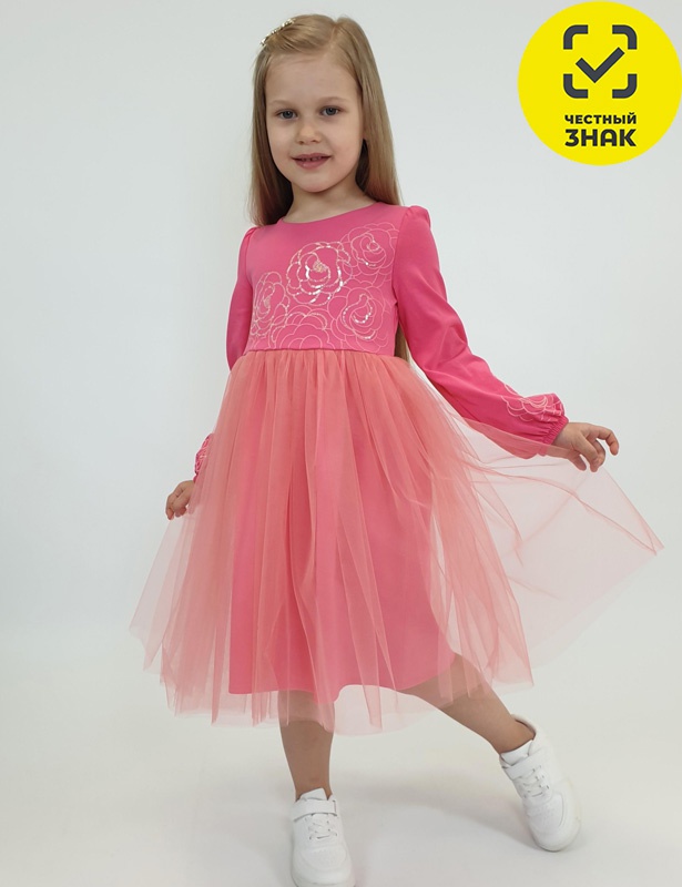 Платье для девочки, приталенного силуэта на подкладке. Длинный рукав-сборка по окату, внизу на резинке. Отрезная юбка на подкладке с сеткой в два слоя. Застежка по спинке на пуговицу. Печать и вышивка(пайетки) на переде и рукавах.