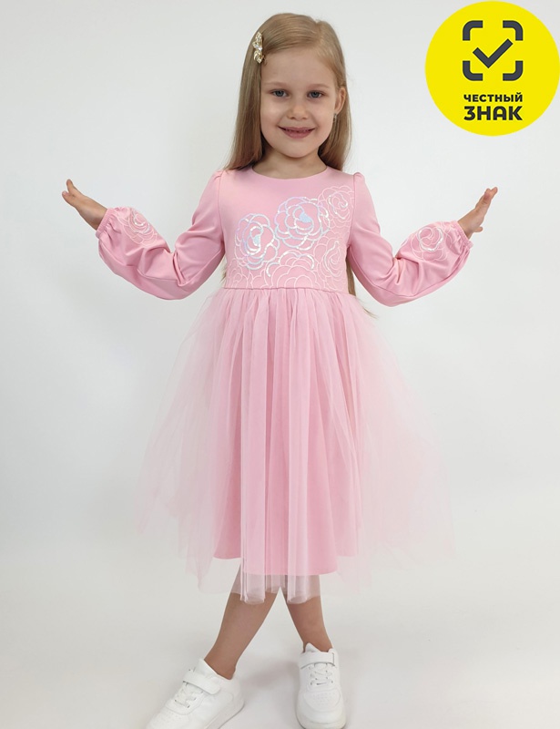 Платье для девочки, приталенного силуэта на подкладке. Длинный рукав-сборка по окату, внизу на резинке. Отрезная юбка на подкладке с сеткой в два слоя. Застежка по спинке на пуговицу. Печать и вышивка(пайетки) на переде и рукавах.