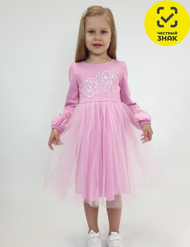 Платье для девочки, приталенного силуэта на подкладке. Длинный рукав-сборка по окату, внизу на резинке. Отрезная юбка на подкладке с сеткой в два слоя. Застежка по спинке на пуговицу. Печать и вышивка(пайетки) на переде и рукавах.