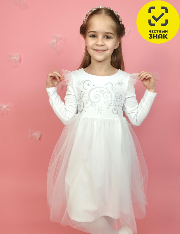 Платье силуэта трапеция, втачной длинный рукав с отделочным элементом из сетки. Отрезная юбка с сеткой (100% пэ), горловина обработана обтачкой. Печать на полочке со стразами. Застежка по спинке на 1 пуговицу.