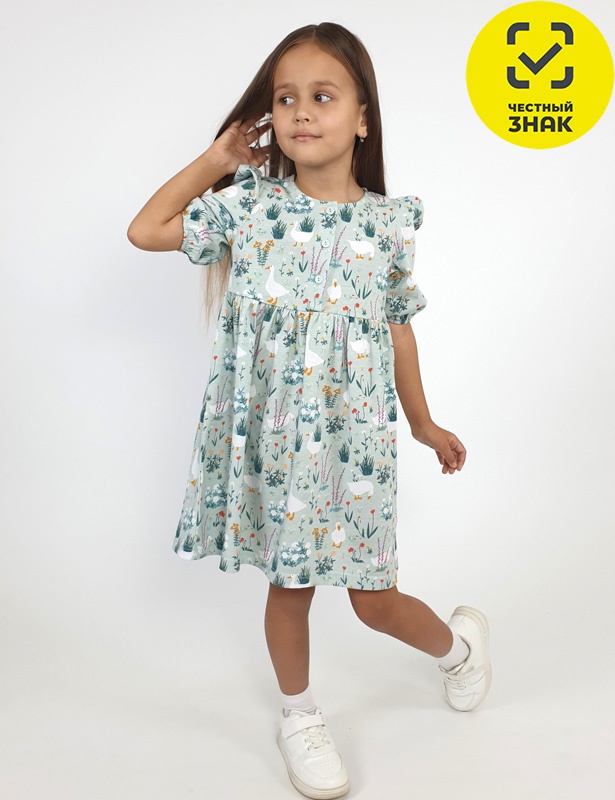 Платье для девочки с отрезной юбкой в сборку. Короткий рукав с резинкой внизу, сборка по окату. Горловина окантована и подшита, застежка центральная на пуговицы.