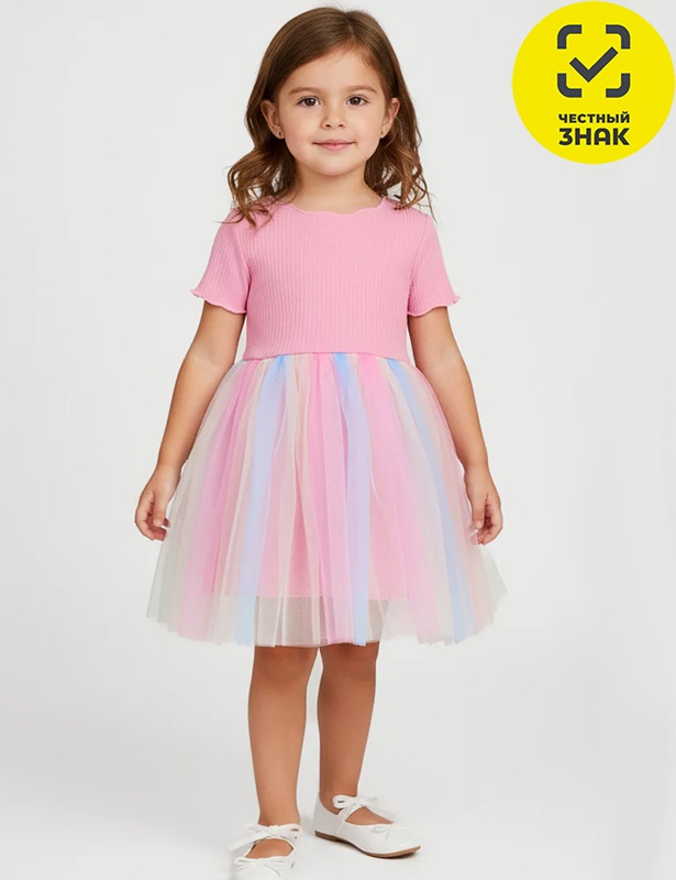 Платье для девочки, короткий втачной рукав, отрезное по линии талии, верх из гладкокрашеного полотна лапша, обработка горловины и рукава спираным швом, юбка из фатина.