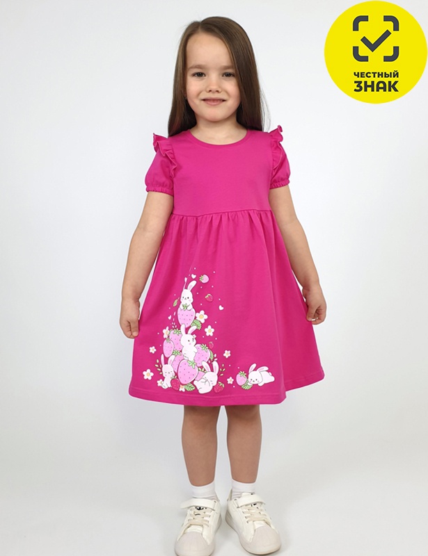 Платье для девочки - перед и спинка с кокеткой, сборка по верху юбки. Рукав короткий, внизу собран на резинку, в пройме рюша. Горловина обработана ластиком. Печать на переднем полотнище юбки.