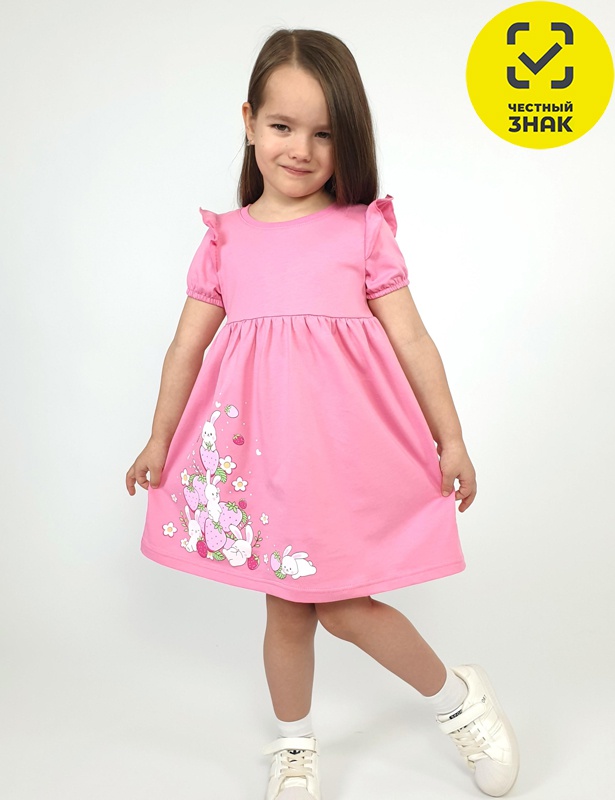 Платье для девочки - перед и спинка с кокеткой, сборка по верху юбки. Рукав короткий, внизу собран на резинку, в пройме рюша. Горловина обработана ластиком. Печать на переднем полотнище юбки.