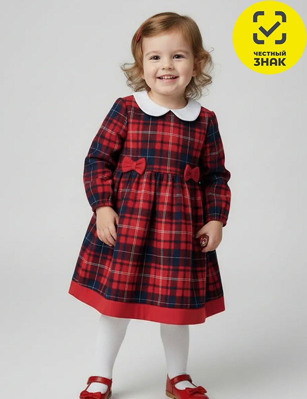Платье для девочки в клетку из футера с начесом, длинные втачные рукава, отложной воротник, отрезная юбка со сборкой, декорирована бантиками.