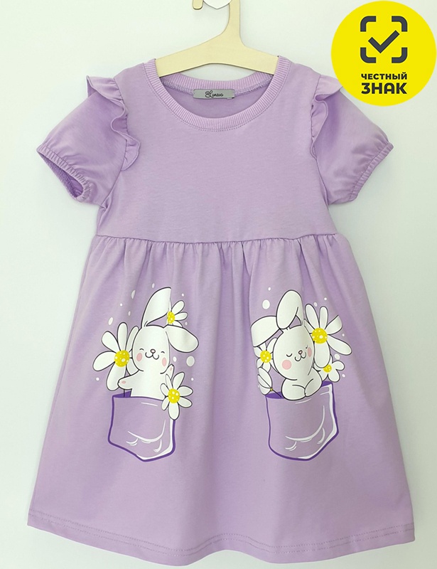 Платье для девочки, перед и спинка с кокеткой, сборка по верху юбки. Рукав короткий, внизу собран на резинку, в пройме рюша. Горловина обработана ластиком. Печать на переднем полотнище юбки.