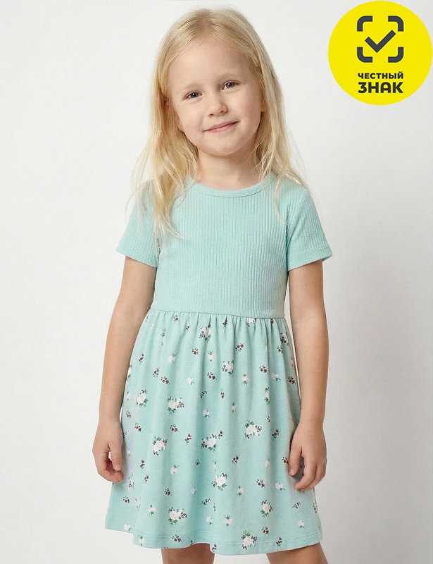 Платье для девочки, короткий втачной рукав, отрезное по линии талии, верх из гладкокрашеного полотна лапша, юбка из набивного полотна.