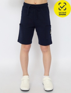 Шорты для мальчика из кулирной глади повышенной плотности. Верх шорт обработан притачным поясом из основного полотна, внутрь вставлена резинка и шнурок. В боковой части расположены накладные карманы с декоративной нашивкой.