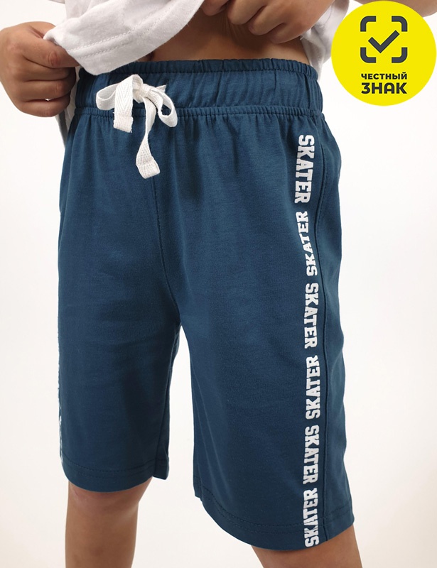 Шорты для мальчика, удлиненные, с притачным поясом, с резинкой по талии и функциональным шнуром. Печать - вдоль бокового шва на передних половинках.