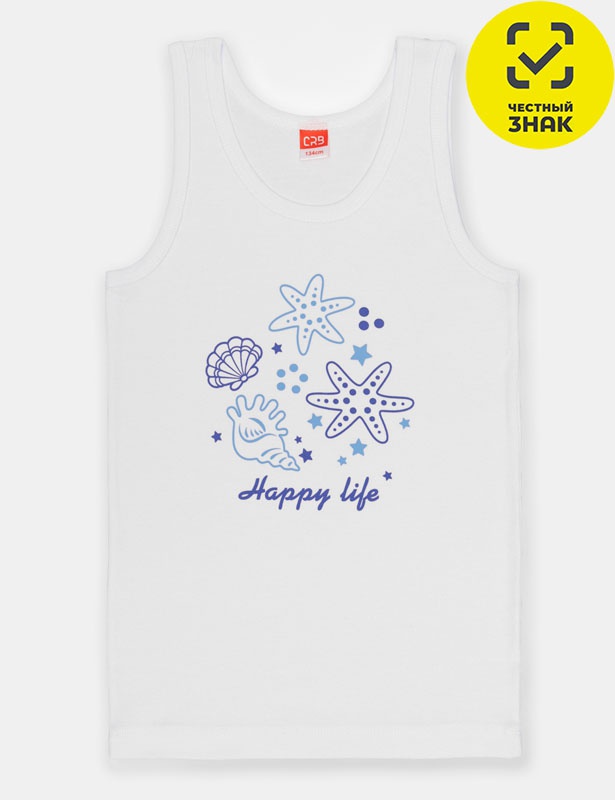 Гладкокрашеная майка с плечом. Горловина и проймы обработаны окантовкой из основного полотна. Перед оформлен шелкографией.