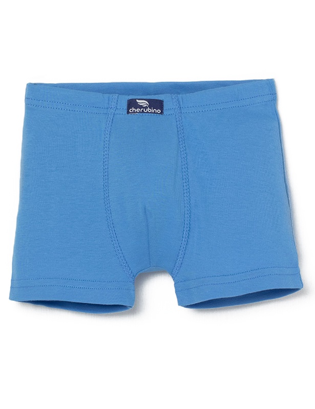 Трусы-боксеры из гладкокрашеного полотна. Верхние и нижние срезы трусов-боксеров обработаны плоским швом вподгибку. По верху одновременно проложена резинка. Швы притачивания вставки и ластовицы спереди оформлены декоративной строчкой в цвет основы. Посередине верхнего края переда настрочена декоративная этикетка.
