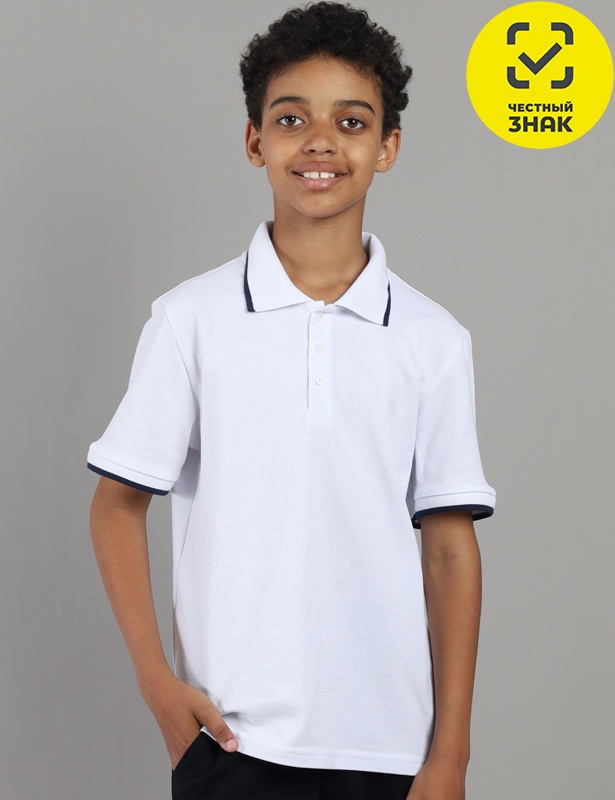 Рубашка-поло для мальчика. Модель с короткими рукавами и отложным воротником. Спереди застежка на пуговицы. Воротник и манжеты оформлены декоративной полоской контрастного цвета.