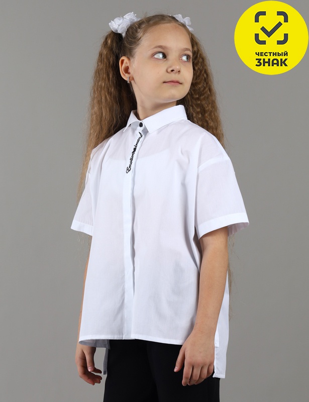 Оверсайз блузка из хлопковой сорочечной ткани, свободного силуэта с отложным воротником и короткими рукавами. Застёжка центральная потайная на планку с пуговицами. Спинка длиннее полочки. По бокам разрезы. Декорирована вышивкой на планке.