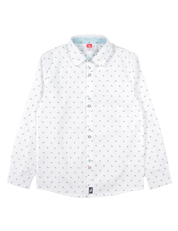 Рубашка из набивного полотна, полуприталенного силуэта, с длинным рукавом рубашечного покроя, с притачными манжетами, с застегивающейся шлицей рукава из хлопка. Воротник обтачной с притачной стойкой. Спереди нашивка. Нашивка, стойка и пуговицы контрастных цветов.