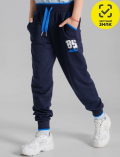 Брюки для мальчика с карманами в боковых швах. Пояс притачной с двухцветной резинкой и шнуром. Нижние срезы брюк оформлены манжетами. Пояс и манжеты выполнены из полотна с эластаном. Декорированы брюки небольшой печатью. Карманы окантованы в цвет резинки.
