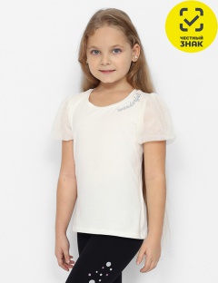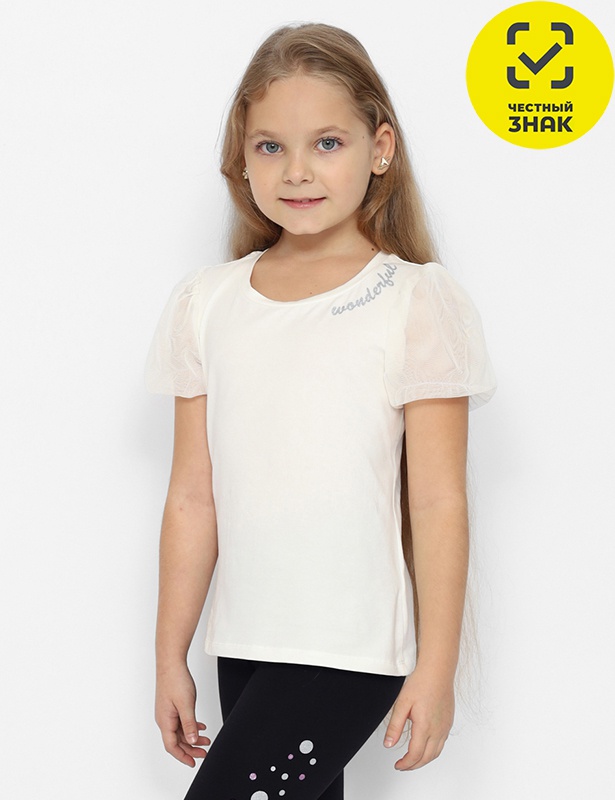 Нарядная блузка из кулирки с эластаном прилегающего силуэта, с короткими рукавами. Модные объемные рукава-фонарики из сетки. Спереди, вдоль воротника, блестящая шелкография глиттером.