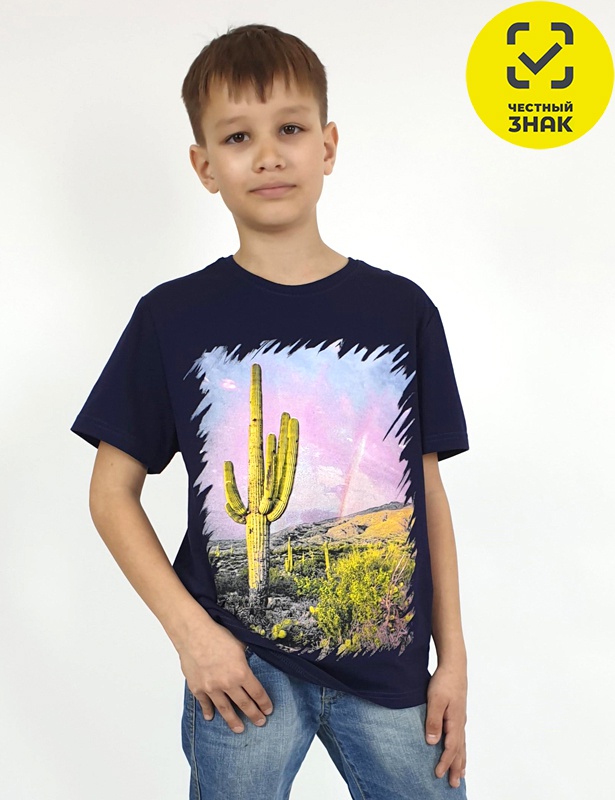 Футболка для мальчика прямого силуэта, перед с печатью, рукав втачной короткий. Горловина обработана ластиком. Низ изделия и рукава подшиты.