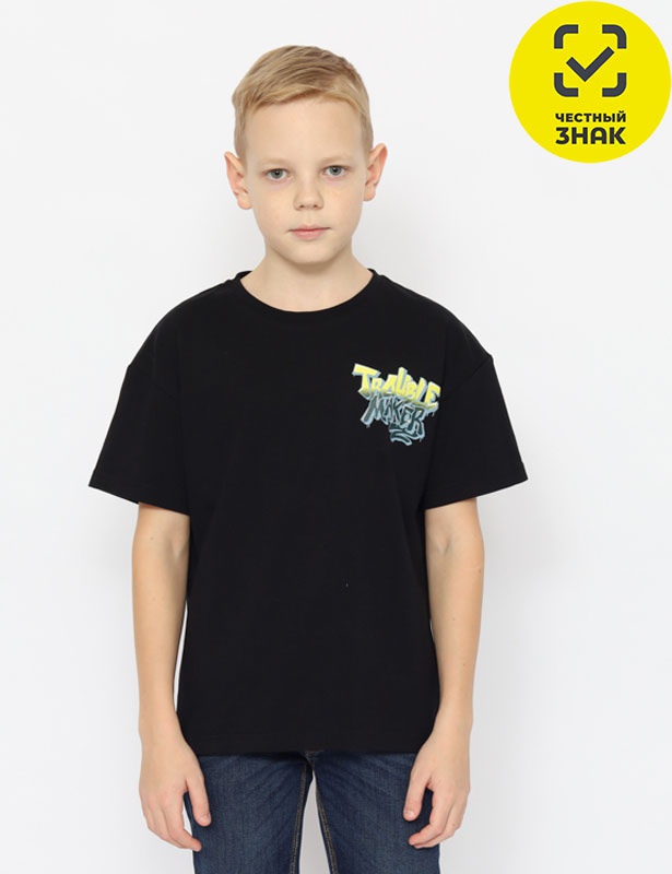 Футболка оверсайз для мальчика из кулирной глади. Рукав втачной, горловина обработана притачной бейкой из рибаны с лайкрой. Перед и спинка декорирован принтом "Нарушитель спокойствия".