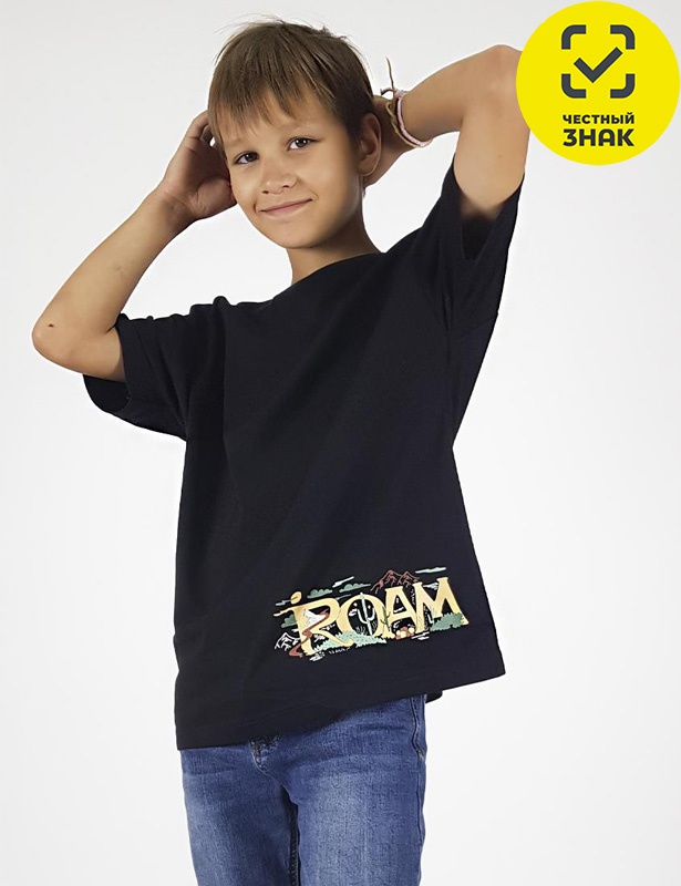 Футболка для мальчика (оверсайз), прямой силуэт спущенное плечо, короткий рукав, перед и спинка с печатью. Горловина обработана планкой из ластика. Низ изделия и рукава подшиты.