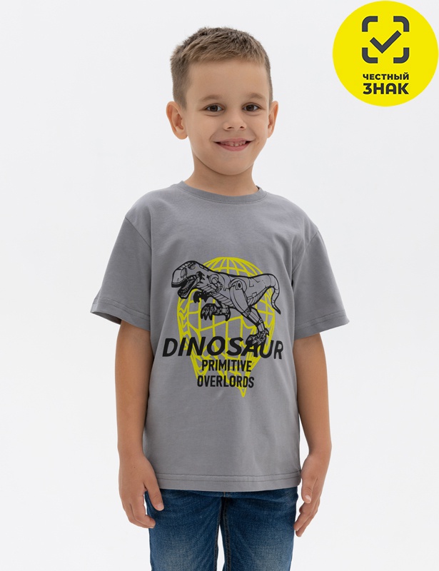 Футболка для мальчика: Футболка гладкокрашенная с коротким рукавом, линия плеча приспущена. Горловина круглая, из рибаны с лайкрой. Перед декорирован прином.