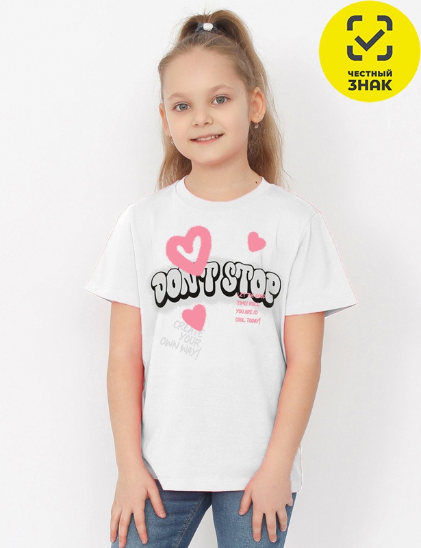 Футболка для девочки из кулирного полотна, с короткими втачными рукавами, округлая горловина, перед декорирован принтом.