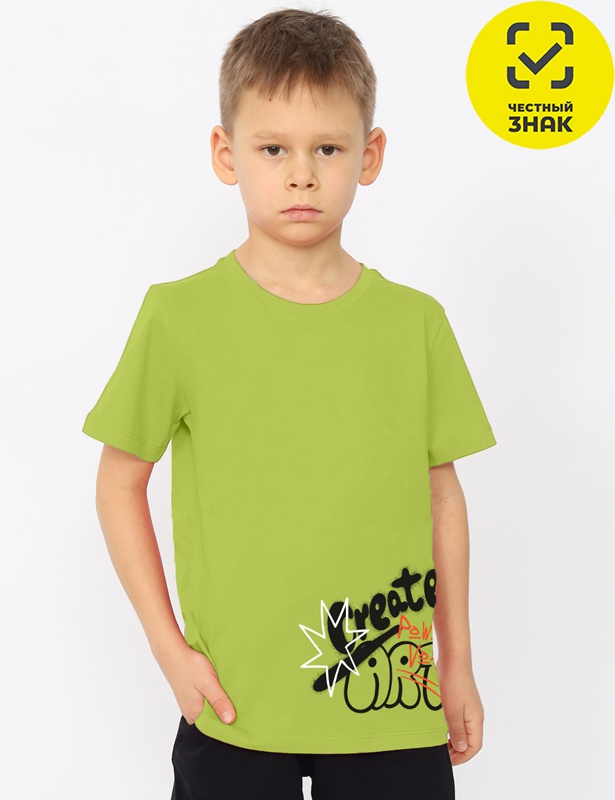 Футболка для мальчика из кулирного полотна, с короткими втачными рукавами, округлая горловина, перед декорирован принтом.