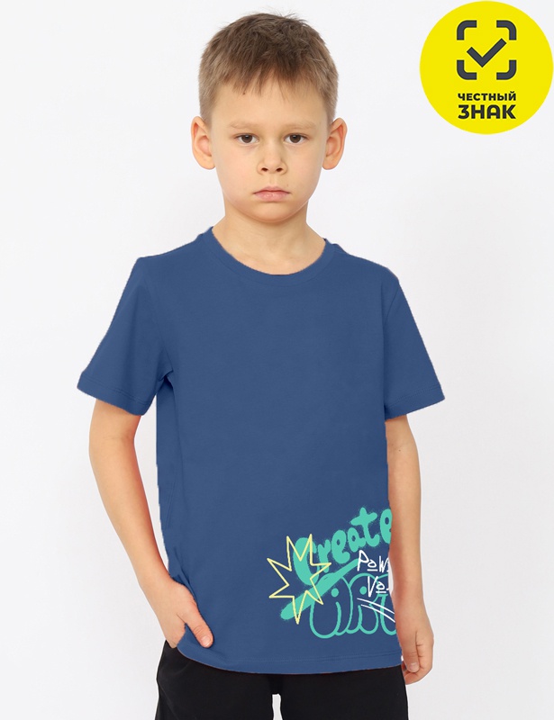 Футболка для мальчика из кулирного полотна, с короткими втачными рукавами, округлая горловина, перед декорирован принтом.