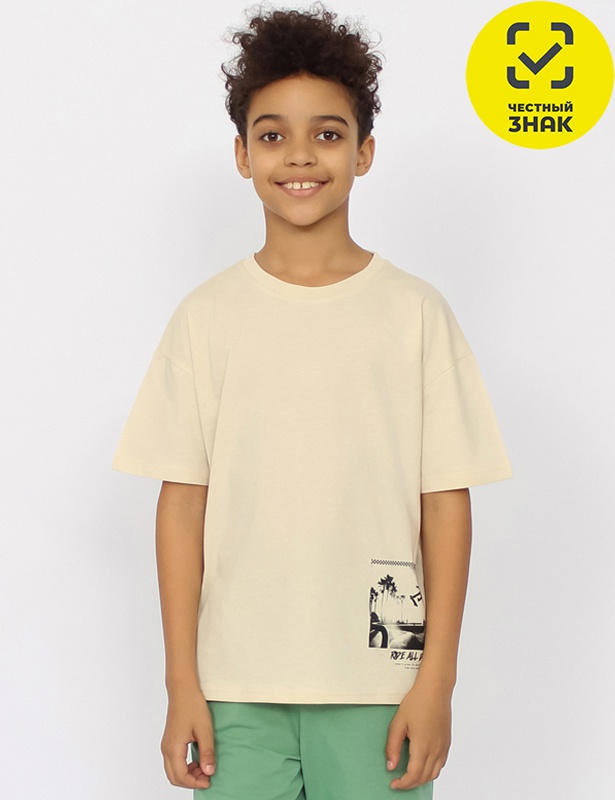 Футболка для мальчика свободного покроя. Рукав втачной, горловина обработана притачной бейкой из рибаны с лайкрой. Перед декорирован принтом.