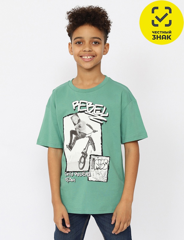 Футболка оверсайз для мальчика из кулирной глади. Рукав втачной, горловина обработана притачной бейкой из рибаны с лайкрой. Перед декорирован принтом "Бунтарь".