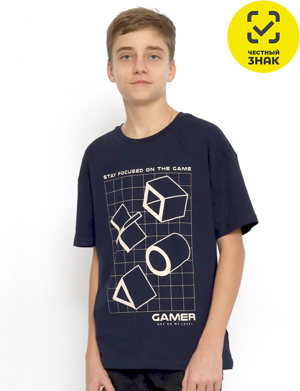Футболка для мальчика свободного покроя. Рукав втачной, горловина обработана притачной бейкой из рибаны с лайкрой. Перед декорирован принтом.