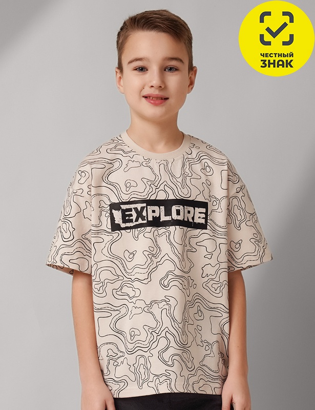Футболка для мальчика из набивного трикотажа, прямого кроя, горловина окантована, короткий втачной рукав. Декорирована принтом.